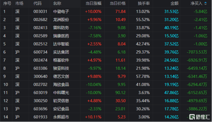 龙虎榜单日净卖出额前三为中瓷电子、龙洲股份、雷科防务,分别为5.84亿、2.41亿、1.41亿。