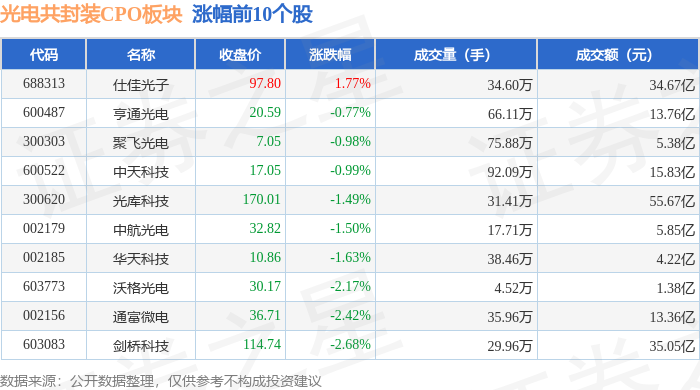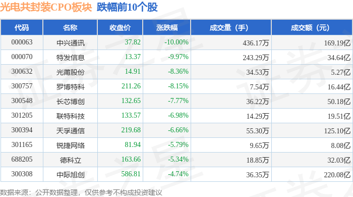 证券之星消息,12月11日光电共封装CPO板块较上一交易日下跌4.51%,中兴通讯领跌。当日上证指数报收于3873.32,下跌0.7%。深证成指报收于13147.39,下跌1.27%。光电共封装CPO板块个股涨跌见下表: