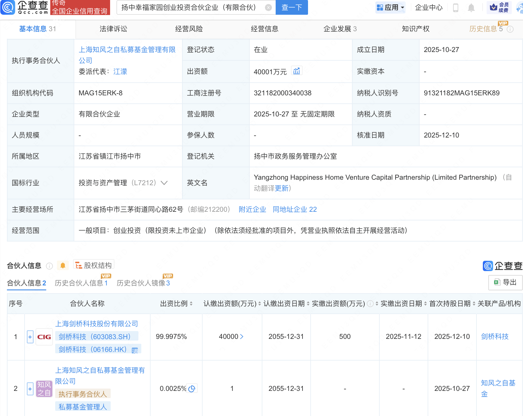 企查查APP显示,近日,扬中幸福家园创业投资合伙企业(有限合伙)发生工商变更,陈璐退出合伙人行列,新增剑桥科技(603083)为大股东,持股99.9975%。企查查信息显示,该企业成立于2025年10月,经营范围包含:创业投资(限投资未上市企业)。