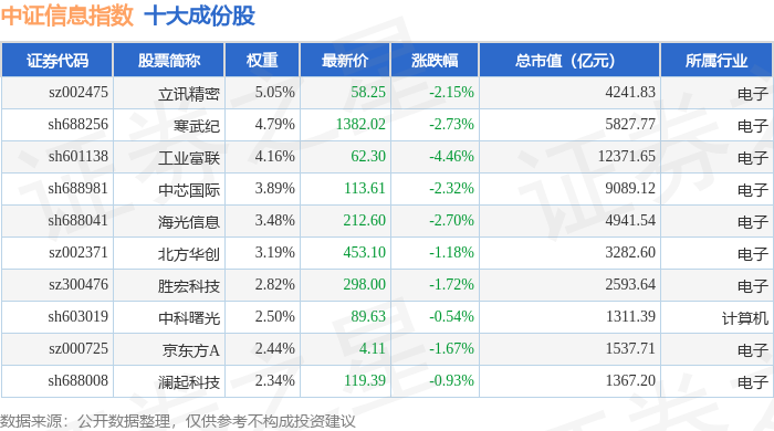 证券之星消息,12月11日,中证信息(399935)指数报收于6224.66点,跌1.78%,成交2018.86亿元,换手率1.92%。当日该指数成份股中,上涨的有19家,立昂微以10.01%的涨幅领涨,下跌的有107家,深南电路以6.02%的跌幅领跌。