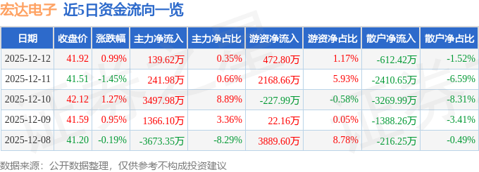 证券之星消息,截至2025年12月12日收盘,宏达电子(300726)报收于41.92元,上涨0.99%,换手率4.47%,成交量9.58万手,成交额4.03亿元。