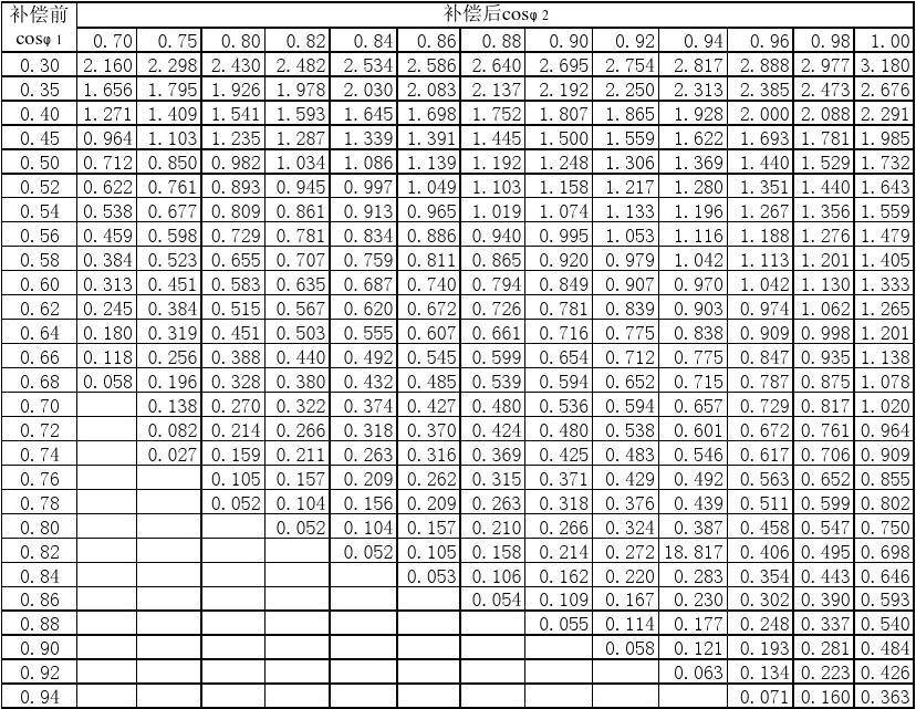 第三种则是直接查表,只需要知道补偿前和补偿后的功率因数,就可以直接从表中查得系数,再乘以有功功率即可得出所需补偿的无功容量。