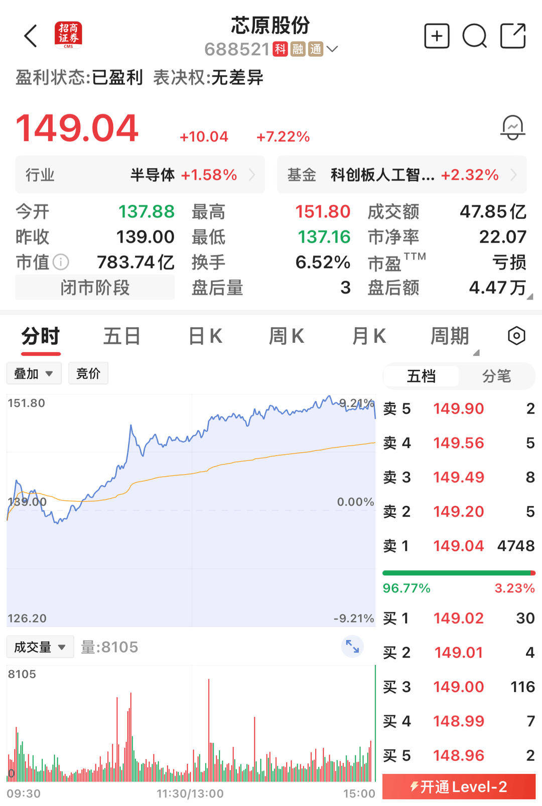 芯原股份股价报149.04元/股,总市值为783.74亿元。