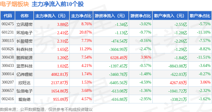 从资金流向上来看,当日电子烟板块主力资金净流入6.79亿元,游资资金净流出3.98亿元,散户资金净流出2.8亿元。电子烟板块个股资金流向见下表: