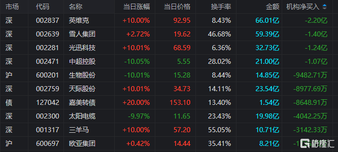 龙虎榜中涉及机构专用席位的个股中,单日净卖出额前三为英维克、雪人集团、光迅科技,分别为2.20亿元、1.40亿元、1.24亿元。