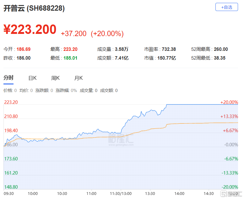 今日收报223.2元,涨跌幅20.00%,偏离值20.00%,换手率5.29%,成交额7.41亿,机构净买入1.07亿元。