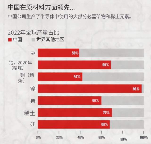 砷方面,中国占全球的39%,精炼的钴中国占69%,精炼铜中国占42%,镓占98%,锗占68%,稀土占60%,硅占68%。