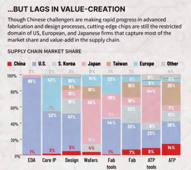 但是,在整个芯片的产业链中,最具价值的是设计占29.8%,而制造占38.4%,半导体设备占14.9%,而在这些最具价值的领域,中国的表现不如美国等强国,那确实是由美国、欧洲、日本和韩国公司垄断,他们攫取了大部分的价值和市场。