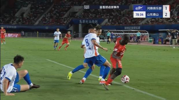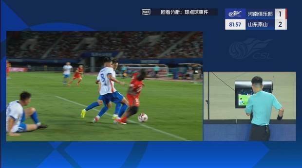 直播吧06月30日讯 中超第16轮,河南vs山东泰山。比赛第77分钟,阿奇姆彭在禁区线上倒地,VAR介入,判给河南队点球!