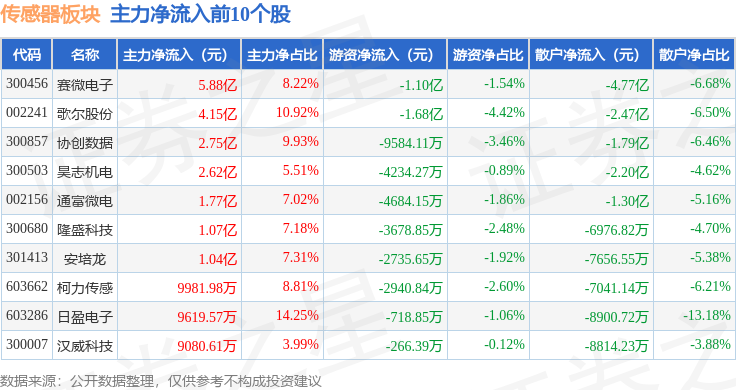 从资金流向上来看,当日传感器板块主力资金净流入6861.68万元,游资资金净流出2.46亿元,散户资金净流入1.78亿元。传感器板块个股资金流向见下表: