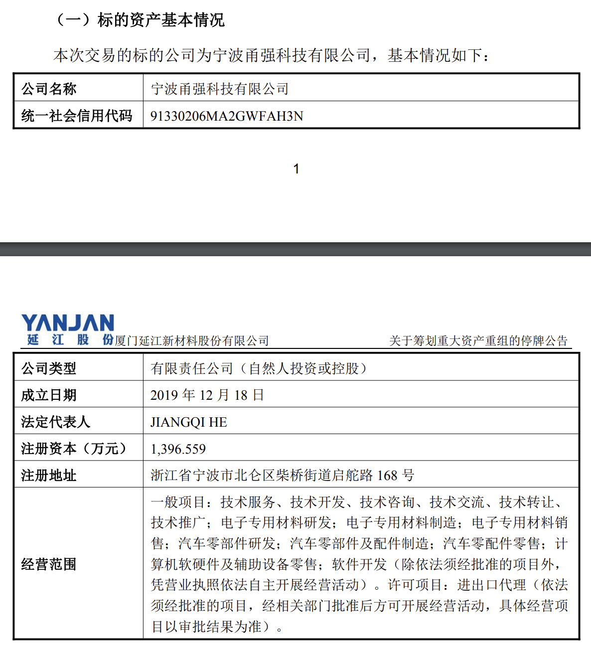 延江股份(300658.SZ)日前发布停牌公告,拟通过发行股份及支付现金方式购买宁波甬强科技有限公司(下称“甬强科技”)的控制权,同时募集配套资金,预计构成重大资产重组。
