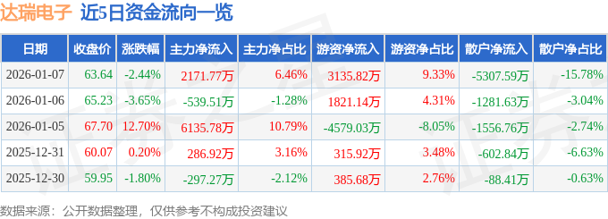 证券之星消息,截至2026年1月7日收盘,达瑞电子(300976)报收于63.64元,下跌2.44%,换手率6.11%,成交量5.26万手,成交额3.36亿元。
