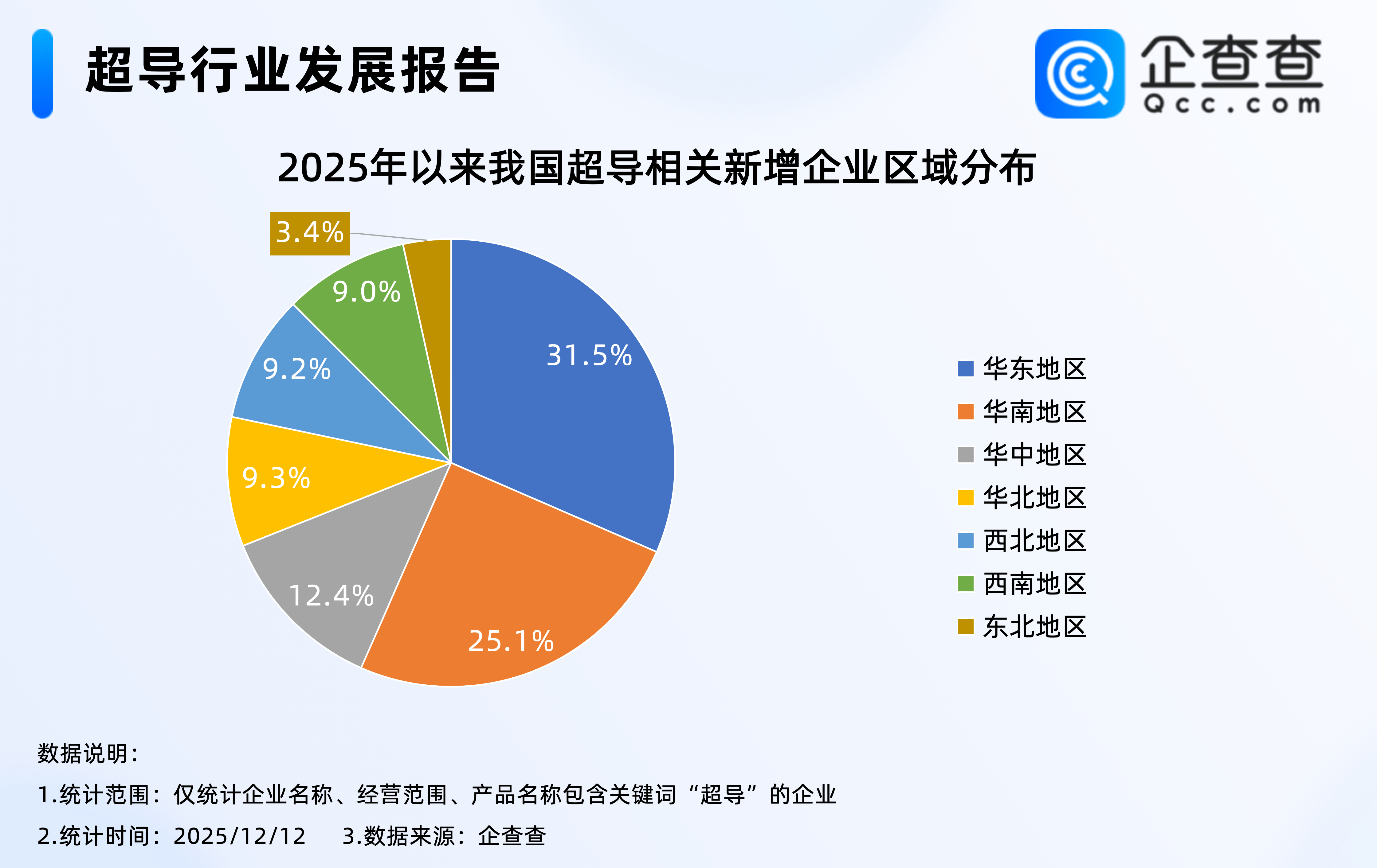 企查查数据显示,2025年以来新注册的8731家超导相关企业中,超三成相关企业位于华东地区,占比达31.5%,其次华南地区占比25.1%,东北地区相对最少,占比3.4%。
