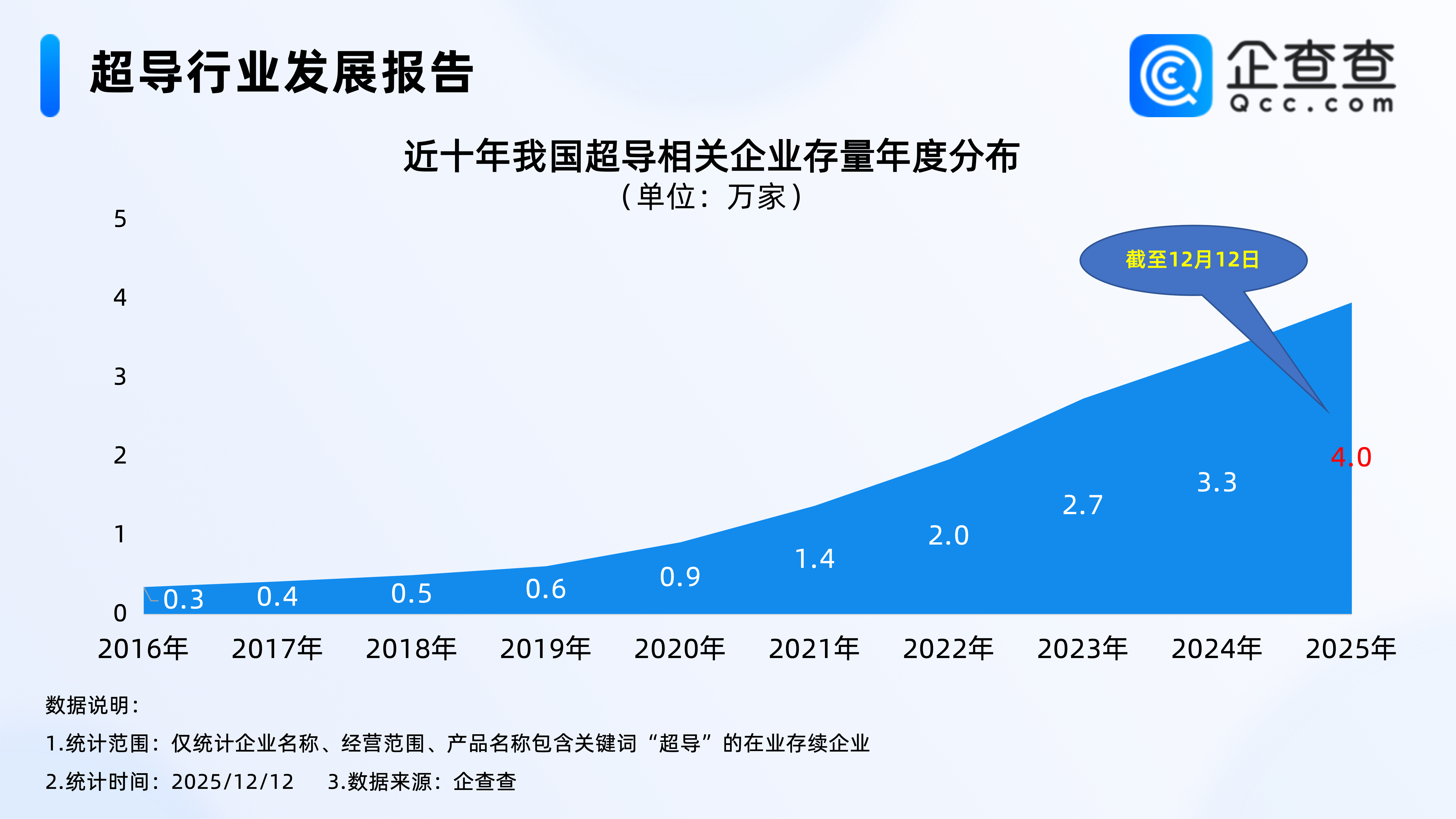 企查查数据显示,2016年开始,我国超导相关企业存量稳步增加。截至2019年末,相关企业存量达0.6万家。2020年开始,超导相关企业存量增速加快,截至2023年末超导相关企业存量达2.7万家;截至2025年12月12日,我国现存4.0万家超导相关企业。