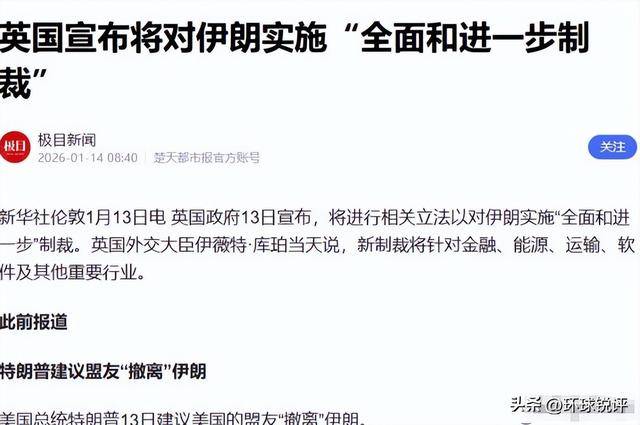 特朗普的“通牒”刚落地,英国就火速跟进,上演了一场盟友式宣战,1月13日,英国政府正式宣布推进专项立法,将对伊朗实施覆盖金融、能源、运输、软件等关键领域的“全面且进一步”制裁。