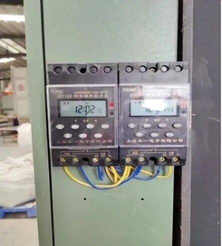 26.车间门侧配电箱外侧安装的微电脑控制开关缺防护盖。