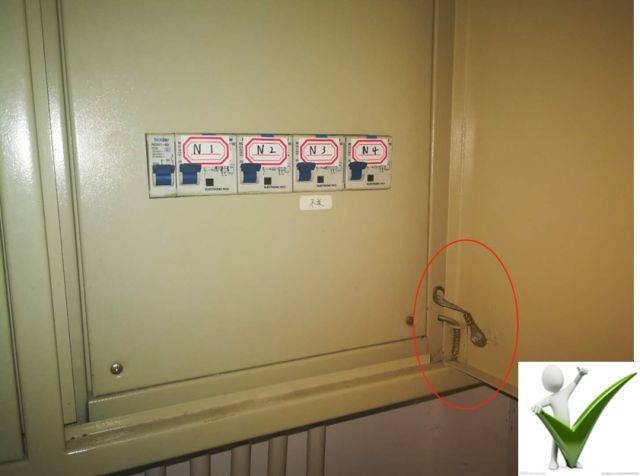 5.检查配电箱金属箱门与金属箱体有没有采用编织软铜线做接地及跨接,有没有采用焊接、压接、螺栓连接,绝不能缠绕或挂钩,防止故障时电箱外壳带电。