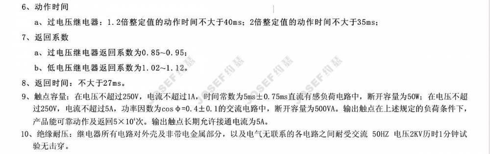 动作时间:过电压继电器在1.2倍整定值时,动作时间不大于25ms;在2倍整定值时,动作时间不大于20ms。低电压继电器当工作电压为0.5倍整定电压时,动作时间不大于20ms。