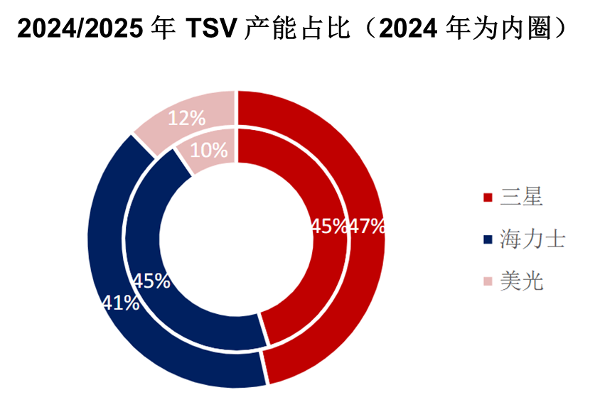 根据 Trendforce 数据, 2024 年三家的 TSV 月产能分别为 12 万片、12 万片、2.5 万片,对应市场占比 45%、45%、10%;2025 年产能占比将调整为 47%、41%、12%。