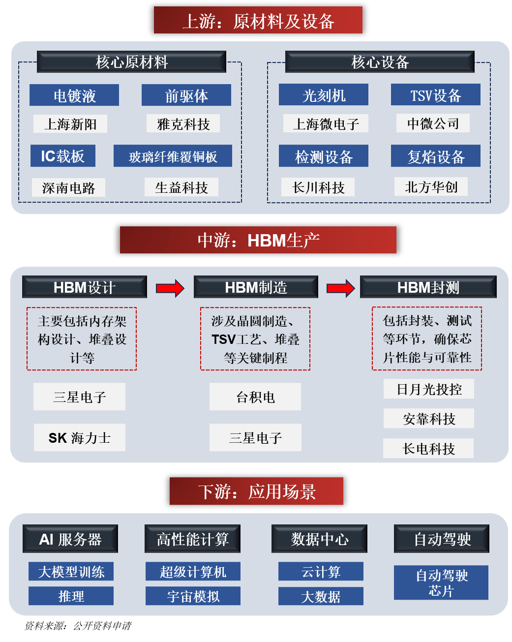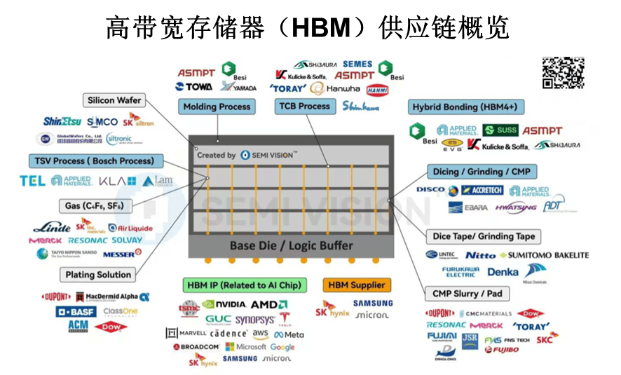 从产业链结构来看,HBM 产业的 上游环节对应着建造仓库所需的基础物料与专业设备:电镀液、前驱体、IC 载板等半导体原材料;TSV 设备、检测设备等半导体设备供应商,则是提供高精度塔吊与专业质检仪器的核心角色。