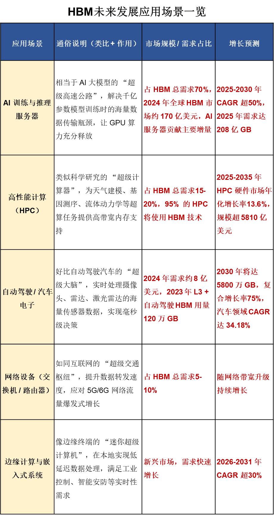AI 服务器是 HBM 最大需求端,占比 70%,是 AI 大模型的 “数据高速通道”,贡献主要增量;HPC 作为传统核心场景,95% 设备依赖 HBM 支撑超算任务。 自动驾驶是未来蓝海,以 75% 高增速领跑。