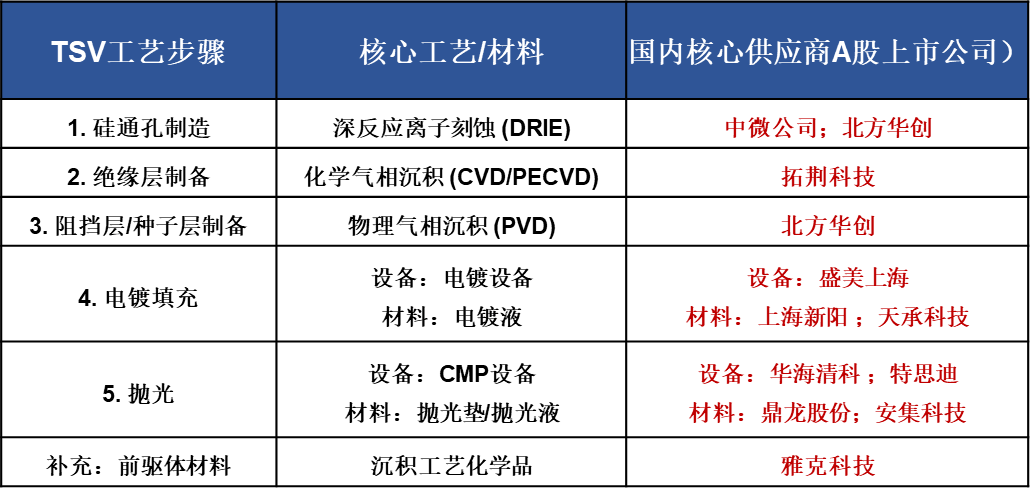 TSV工艺的国产化链条已初步形成, 覆盖了从刻蚀、薄膜沉积、电镀、抛光等关键设备,到电镀液、抛光液、前驱体等核心材料。