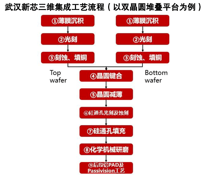 国内已经掌握 HBM 生产所需的 TSV、bumping、堆叠等先进封装工艺,以武汉新芯的晶圆级三维集成技术为例,其核心原理就是在垂直方向上堆叠载片或功能晶圆,再通过 TSV、混合键合等工艺,为不同芯片层搭建起直接的电气互连通道,这项技术已经覆盖了 HBM 生产的三大核心工艺。