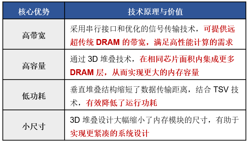 HBM 技术相较于传统内存技术,凭借串行接口与优化信号传输、3D 堆叠、垂直堆叠结合 TSV 技术等手段, 具备高带宽、高容量、低功耗和小尺寸四大优势。