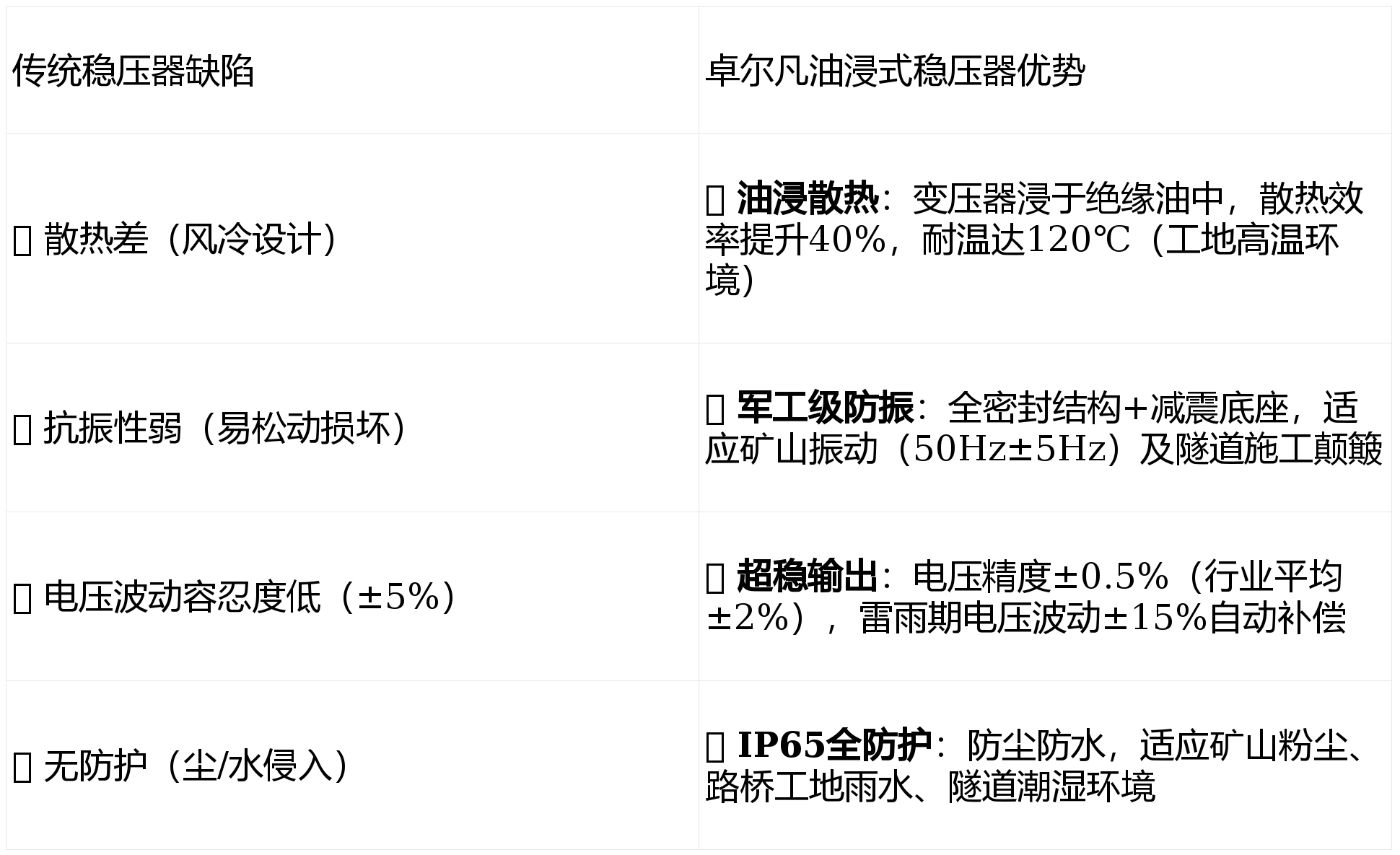 技术突破 :油浸式设计让变压器寿命延长3倍(从5年→15年),24小时连续运行零故障,彻底解决“稳压器一坏,工地停工”的困局!