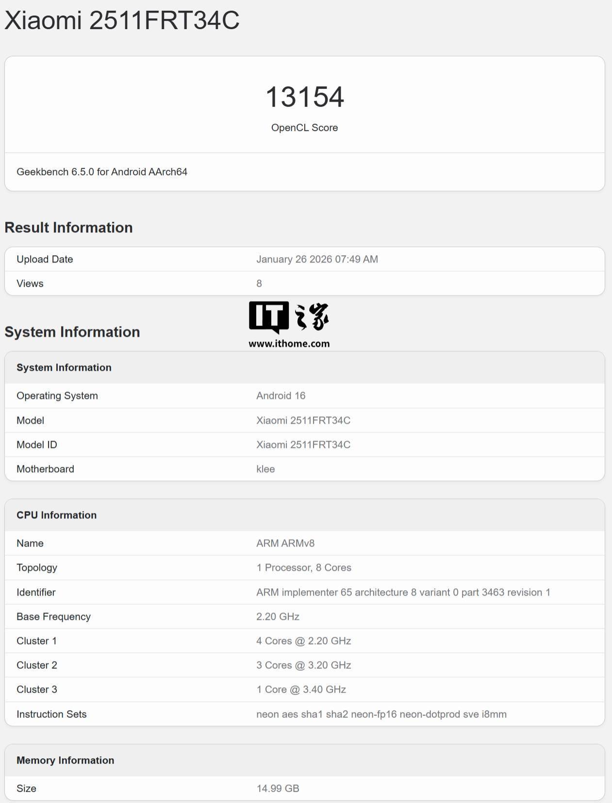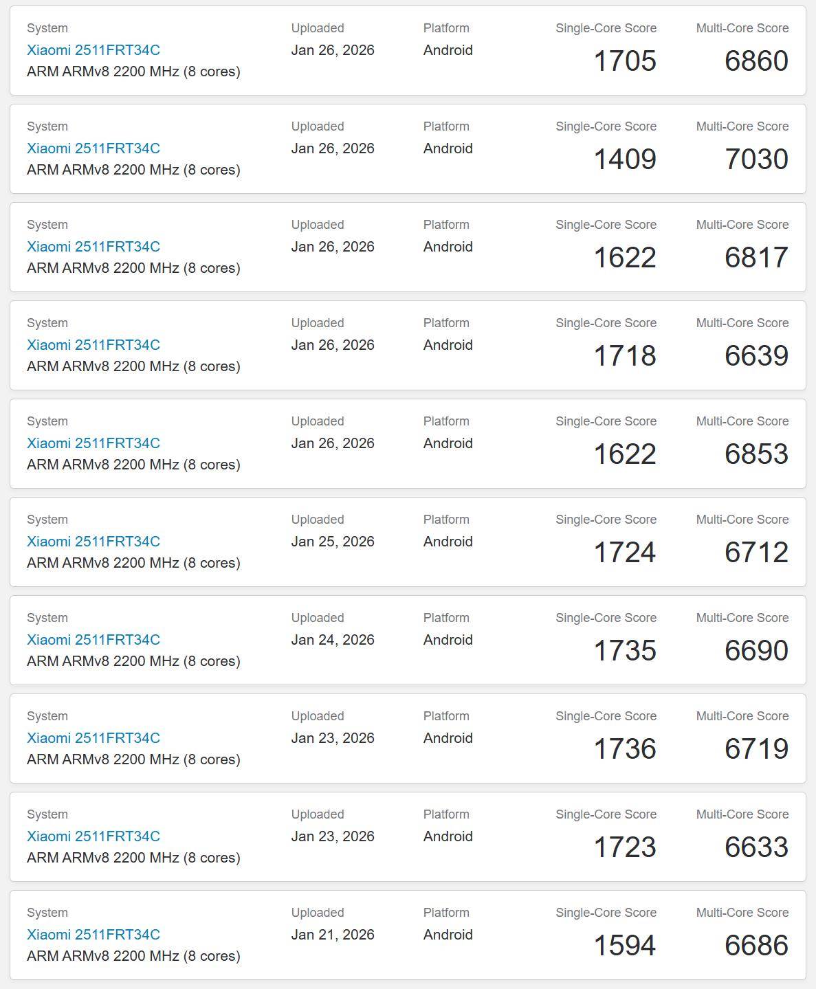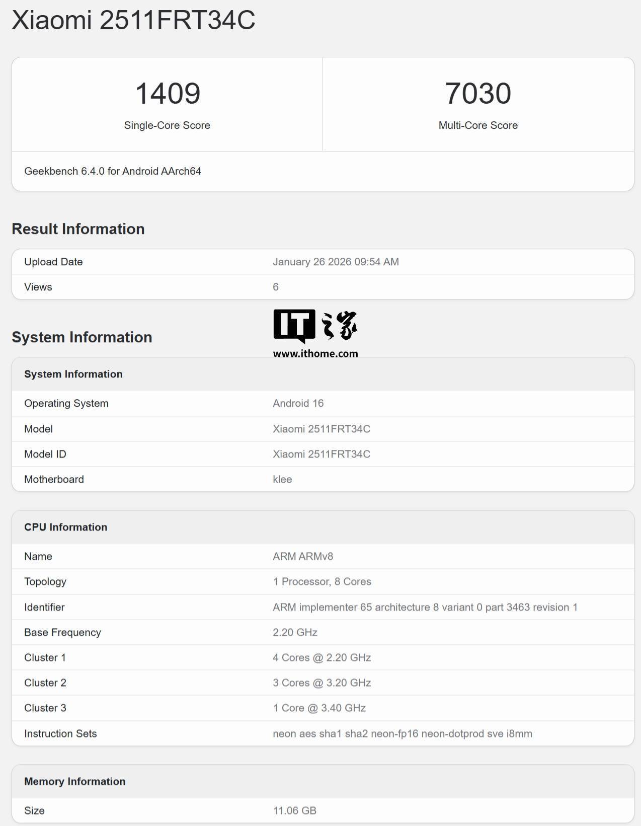 IT之家 1 月 27 日消息,型号为 2511FRT34C 的小米手机近日现身 GeekBench 跑分库,目前共有 10 条 CPU 记录和 1 条 GPU 纪录,该机搭载联发科天玑 8500 芯片,配备 12GB 或 16GB 内存,基于此前 GSMA IMEI 数据库,该机上市后为小米 REDMI Turbo 5 手机。