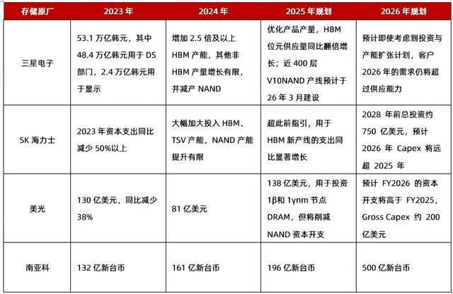 全球头部存储厂资本支出规划