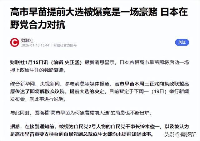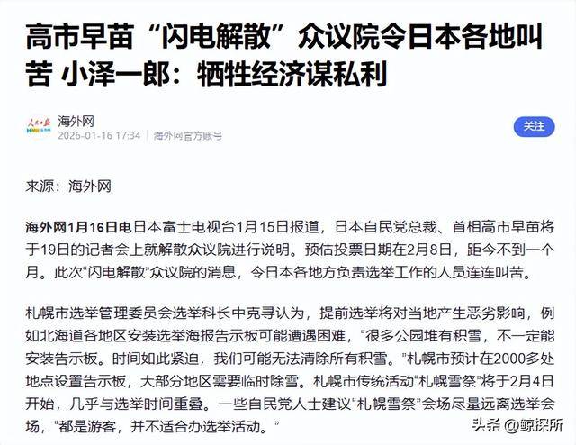 1月19日她将召开发布会官宣解散众议院,2月8日就仓促投票,这场闪电大选不仅让日本地方乱作一团,更让本就承压的经济雪上加霜。