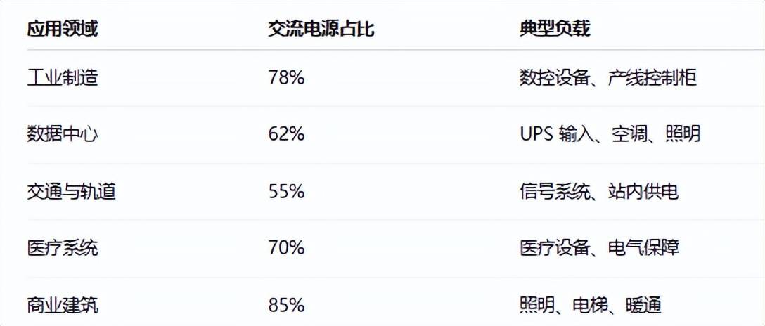 根据国内多家系统集成商在 2022–2024 年项目统计数据,交流电源在不同领域中的占比如下:
