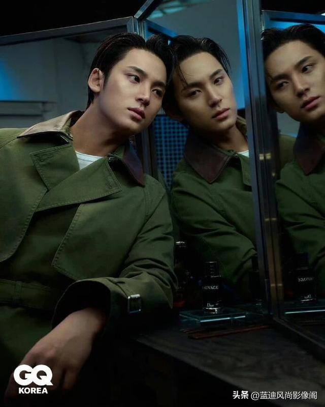 没有复杂的配饰,没有冗余的场景,只有他、光影与衣物的自然对话。军绿色的冷硬、黑色的沉稳,衬得他的冷白皮愈发通透,也衬得他骨子里的野性,不再是少年人的不羁,而是沉淀后的、更有力量的型格表达 —— 他从来不是只能走元气路线的偶像,这份藏在光影里的硬朗与沉敛,本就是他的另一面。