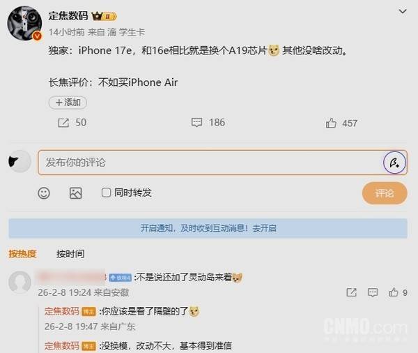 【CNMO科技消息】近日,关于苹果下一代平价手机iPhone 17e的规格传闻出现分歧。与早前广泛流传的“引入灵动岛设计”消息相反,最新消息指出,该机型升级幅度将非常有限,核心变动可能仅在于处理器。