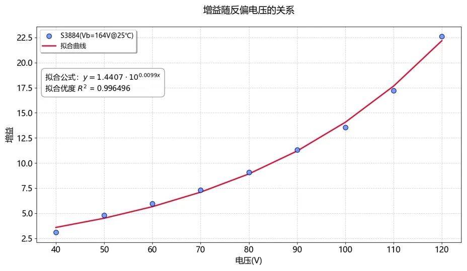 对于反偏电压远低于击穿电压的低增益区间时,我们使用以下指数函数公式进行拟合:
