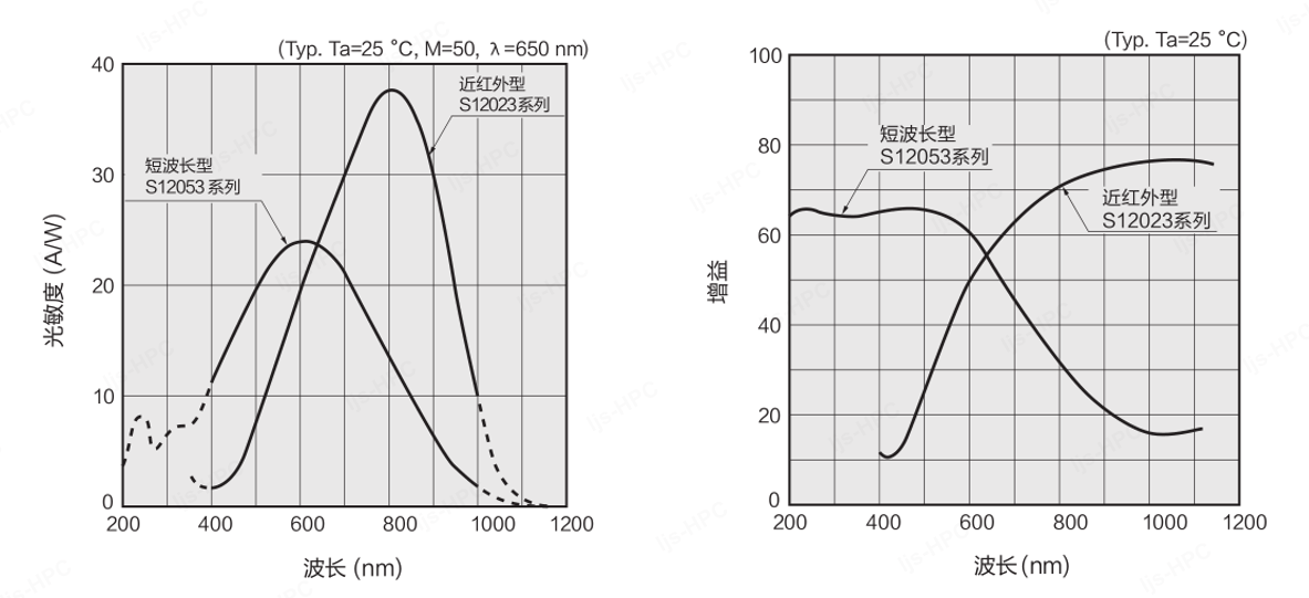 其原理在于:由于长波(如近红外光)的穿透力更强,往往在器件的更深区域激发产生光生载流子。同时,对硅材料而言,电子的电离率比空穴更高。在N-on-P结构中,由长波光子在深处激发的电子需要穿越更长的雪崩倍增区,从而经历更多的碰撞电离机会,因此,N-on-P结构在长波长响应方面具有更高的增益。类似的,P-on-N结构则在短波长响应方面具有更高的增益。如下图所示,该图清晰地展示了短波型和近红外型APD的灵敏度(即增益)随波长的变化趋势。
