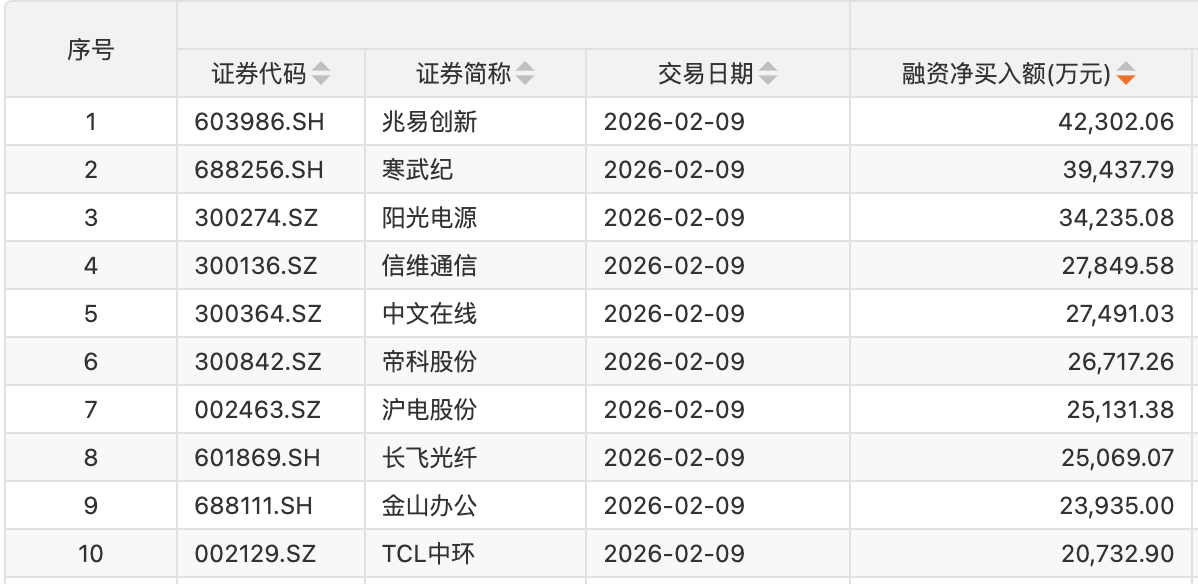 个股方面,34只个股获融资净买入额超1亿元。兆易创新获融资净买入额居首,净买入4.23亿元;融资净买入金额居前的还有寒武纪、阳光电源、信维通信、中文在线、帝科股份、沪电股份、长飞光纤、金山办公、TCL中环等。