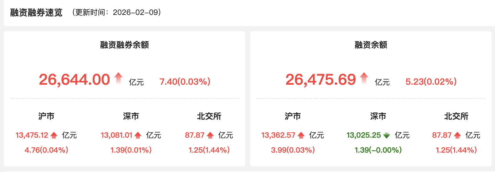 2月9日,A股两融余额为26644.00亿元,较上一交易日增加7.40亿元,占A股流通市值比例为2.56%。当日两融交易额为2166.77亿元,较上一交易日增加255.11亿元,占A股成交额的9.53%。