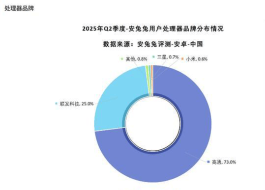 数据显示,高通依然以73%的份额占据绝对主导地位,联发科以25%的份额紧随其后,而三星和小米则分别以0.7%和0.6%的份额位列第三、四位。值得注意的是,小米玄戒处理器在短短一个月内市场份额迅速攀升,几乎追平三星,成为本次数据中最引人瞩目的亮点。