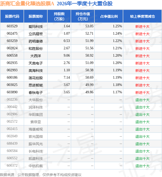 根据2026基金Q1季报公募基金重仓股数据,重仓该股的公募基金共1家,其中持有数量最多的公募基金为浙商证券资管的浙商汇金量化臻选股票A。浙商汇金量化臻选股票A目前规模为0.24亿元,最新净值1.2051(4月17日),较上一交易日下跌0.15%,近一年上涨28.12%。该公募基金现任基金经理为陈顾君。陈顾君在任的基金产品包括:浙商汇金中证A500指数A,管理时间为2025年5月28日至今,期间收益率为20.21%;浙商汇金新兴消费混合,管理时间为2025年8月11日至今,期间收益率为-8.77%;浙商汇金上证科创板综合指数A,管理时间为2025年8月19日至今,期间收益率为13.74%。