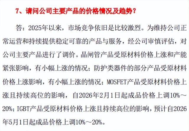 公告显示,为保障正常运营与稳定供货,经审慎评估,捷捷微电启动产品价格调整:晶闸管受原材料涨价、产能紧张双重影响小幅上调;防护类器件部分产品因原材料成本上升小幅涨价。其中,MOSFET产品受原材料价格高位运行影响,自2026年2月1日起成品价格上调10%-20%;IGBT产品同样受原材料成本压力影响,预计自2026年5月1日起成品价格上调10%-20%。公司表示,此次调价为应对持续攀升的生产成本,保障供应链稳定与长期经营能力。