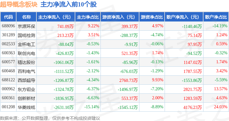 从资金流向上来看,当日超导概念板块主力资金净流出4.08亿元,游资资金净流入702.4万元,散户资金净流入4.01亿元。超导概念板块个股资金流向见下表: