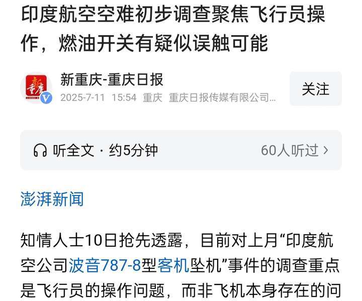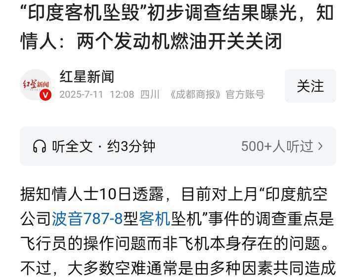 消息来源:《央视新闻》7月12日报道《印航空难首份调查报告:坠机前一刻两台发动机燃料供应被切断,语音记录公布飞行员谈话细节》