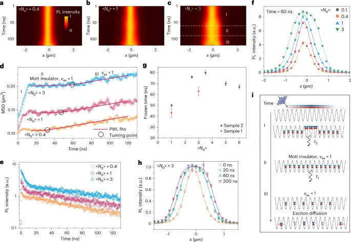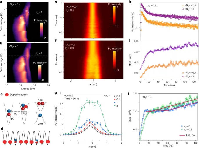 为了验证这一反常现象确实源于激子之间的关联作用,研究团队还进行了对比实验:通过在样品中引入一定浓度的电子,来削弱激子之间的长程偶极斥力。结果发现,在这种相互作用减弱的情况下,激子的“冻结”现象消失了,激子扩散又变得相对正常起来。这进一步证明了:正是激子间的长程偶极相互作用使莫特绝缘相下的激子运动被抑制。