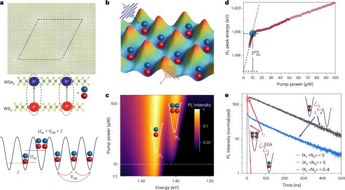 邓时滨告诉 DeepTech,他和合作者首次直接观测并证实了一种新颖的激子量子现象——激子在形成莫特绝缘态前后的输运与“冻结”。简单来说,他们在 WS₂/WSe₂ 的莫尔超晶格中,发现当激子之间存在足够强的相互排斥力时,它们会陷入一种特殊的绝缘状态:每个莫尔晶格的格点上恰好禁锢着一个激子,且激子无法像平常那样在晶格间自由移动,整个激子系统就好比被“锁住”了一样。