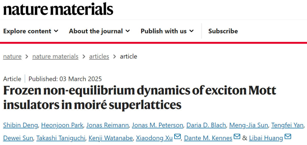 日前,相关论文以《莫瑞超晶格中激子莫特绝缘体的冻结非平衡动力学》(Frozen non-equilibrium dynamics of exciton Mott insulators in moiré superlattices)为题发在 Nature Materials[1],邓时滨与Heonjoon Park、Jonas Reimann为共同第一作者,许晓栋、但丁·肯尼斯(Dante Kennes)、黄丽白担任共同通讯作者。