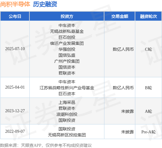 证券之星消息,根据天眼查APP于7月10日公布的信息整理,无锡尚积半导体科技股份有限公司C轮融资,融资额数亿人民币,参与投资的机构包括中车资本,无锡战新私募基金,巨石创投,宿迁产业发展集团,华强创投,国信弘盛,广州产投集团,国信资本,君联资本。
