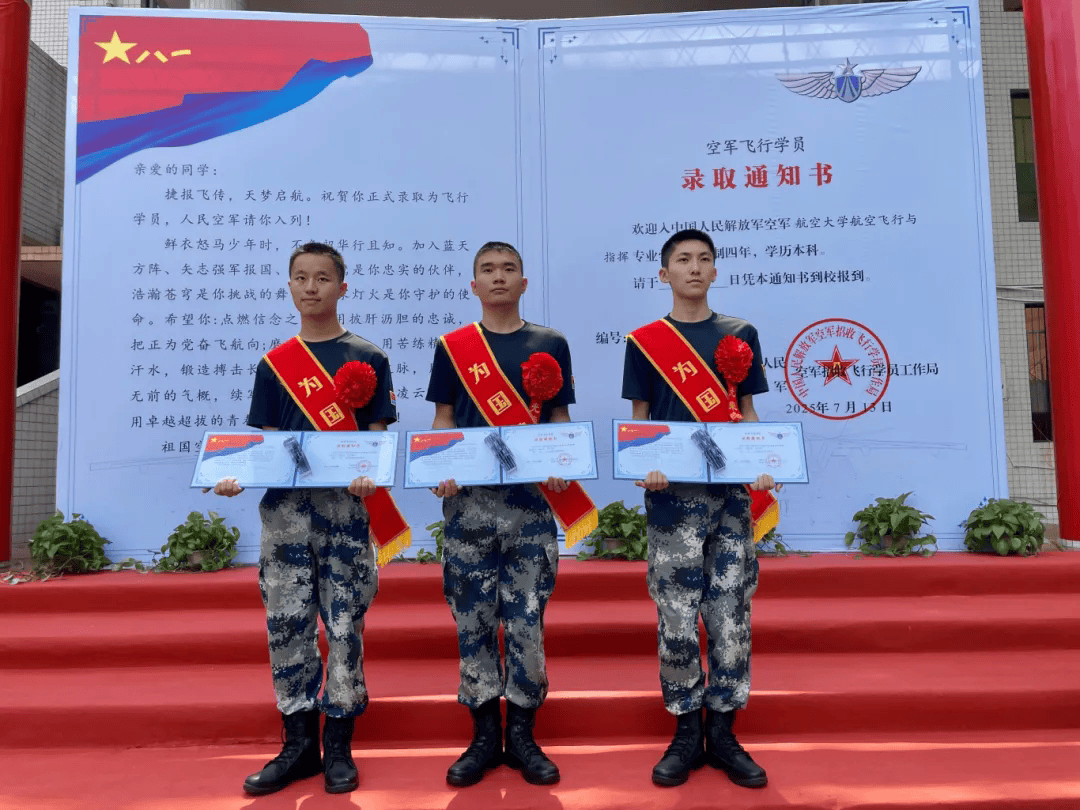 7月13日,四川省眉山市2025年空军飞行学员录取通知书颁发仪式在四川省眉山一中举行。在全场热烈的掌声中,徐坤、刘骞俊、代精鹏三名学子接过了象征荣誉与使命的空军飞行学员录取通知书,正式开启他们逐梦蓝天、保家卫国的壮丽征程。