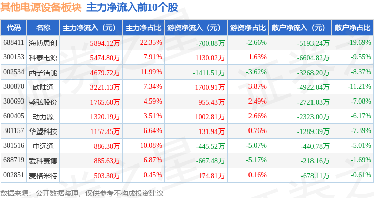 从资金流向上来看,当日其他电源设备板块主力资金净流出7846.88万元,游资资金净流出5271.12万元,散户资金净流入1.31亿元。其他电源设备板块个股资金流向见下表: